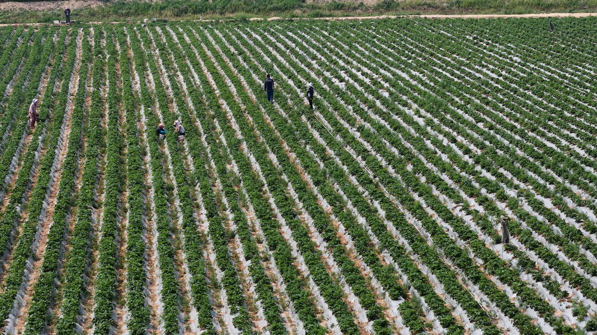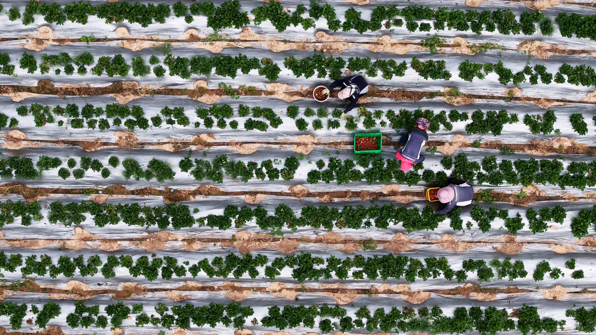 50余畝的草莓種植區,彌漫著清甜的果香。博華種植基地采用水肥一體化滴灌技術,以農家有機肥作底肥,鋪膜防草,整個草莓生長過程不打催熟劑自然成熟,實現生態種植。一壟壟油綠秧苗生機勃勃,一畦畦草莓長勢喜人,今年試種的草莓品種是CF1,采摘期可從5月持續至6月,將主要用于果粉、凍干等產品的深加工。